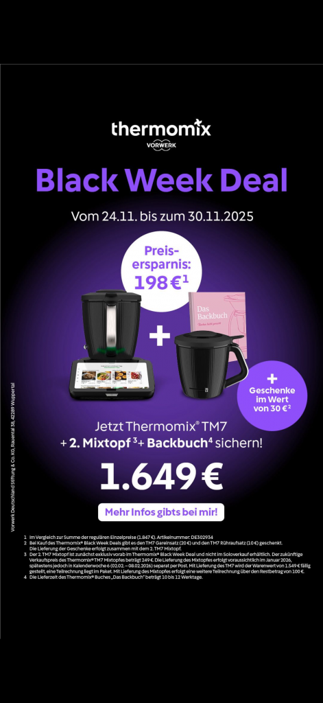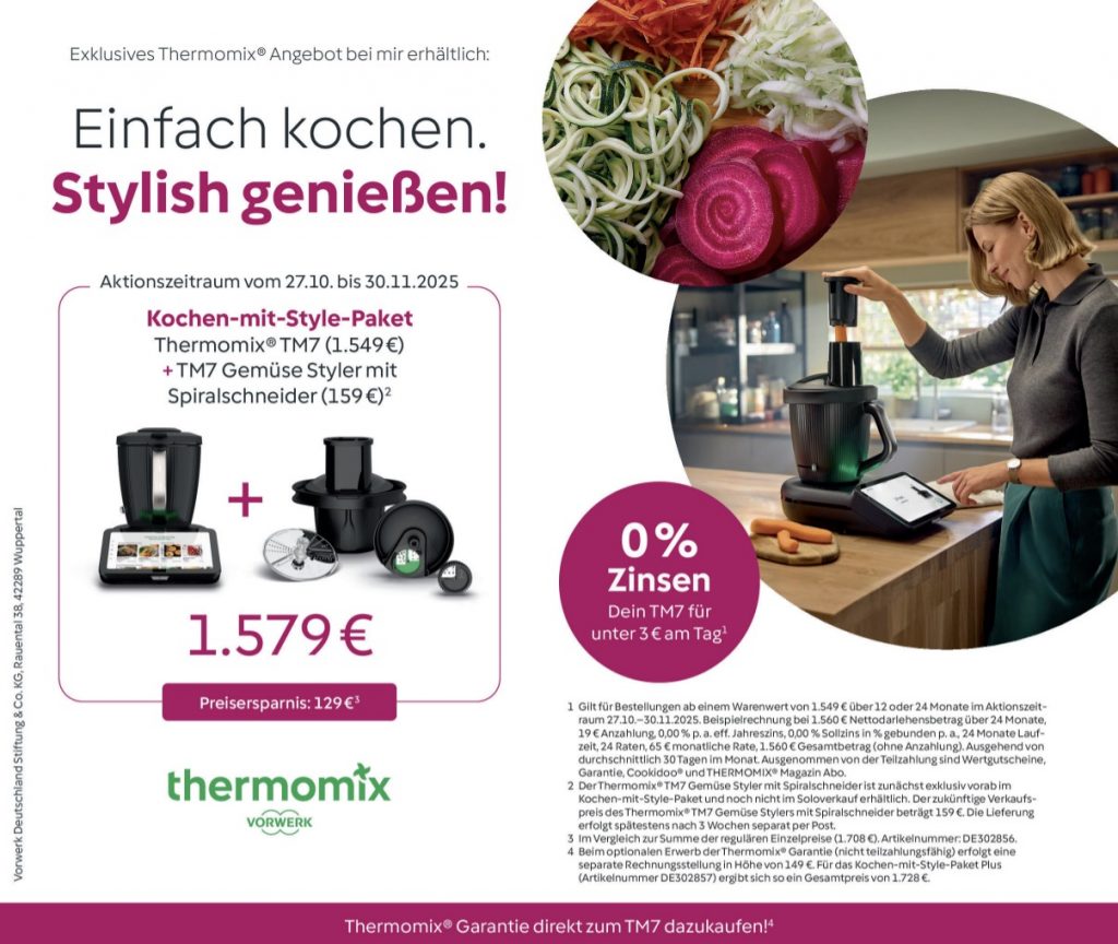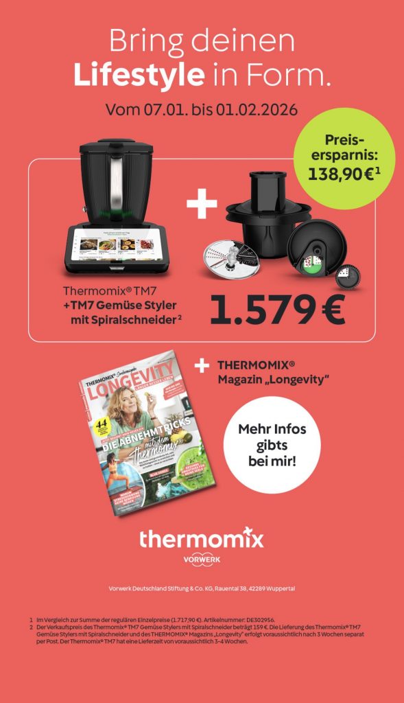 * +100 € Aktionsgutschein für die Durchführung eines Erlebniskochens innerhalb von drei Monaten nach Kaufdatum mit mind. drei Gästen (die den TM7 noch nicht besitzen). Gilt nur für nicht stornierte & nicht widerrufene Aufträge. Die genauen Einlösebedingungen des Aktionsgutscheins unter https://www.Vorwerk-Gutschein.de